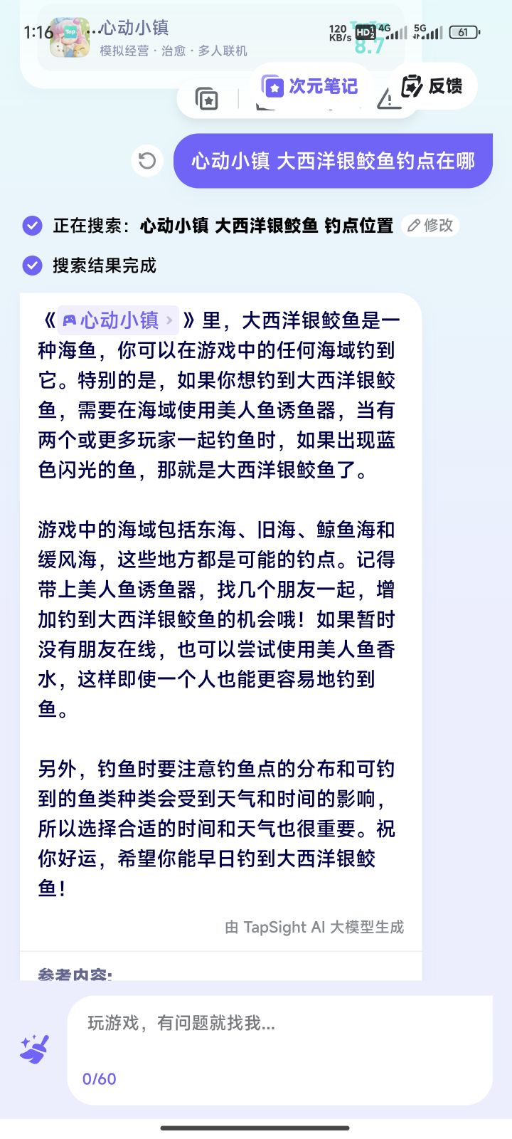 "在《心动小镇》中,大西洋银鲛鱼的钓点在海水区域。你需要使用美人鱼诱鱼器来垂钓蓝色闪光鱼,有几率钓到大西洋银鲛鱼。具体步骤如下: