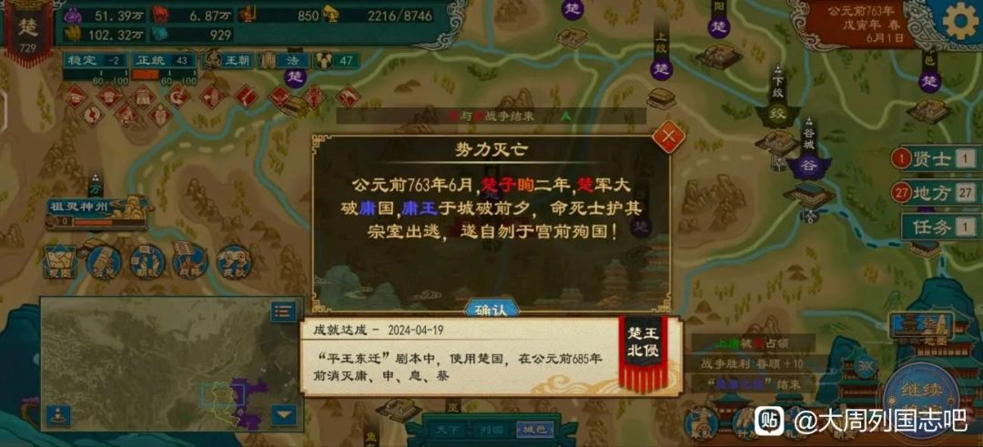 开局投降,等待复国土地叛变,城市多了之后合邦鲁,吞并薛,和赵魏把边境几座城换下,最后宣楚把东海地区城邑拿下完成任务