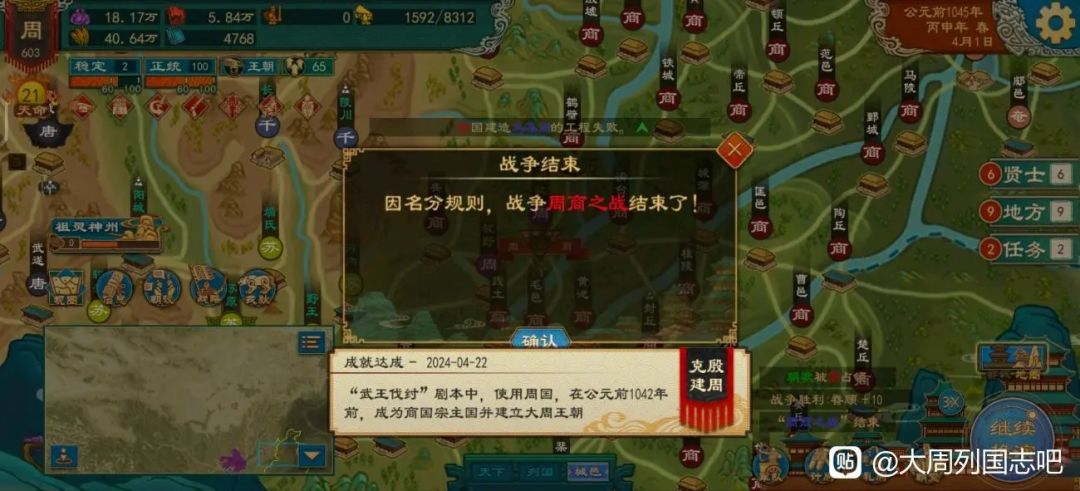 第四年:出兵朝歌,宣战商“统一四海”,灭商。吞并郭,与陆浑,黎宣战,求和放出附庸薄姑与阉。