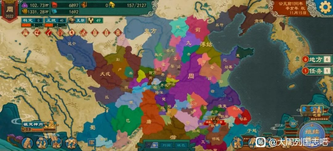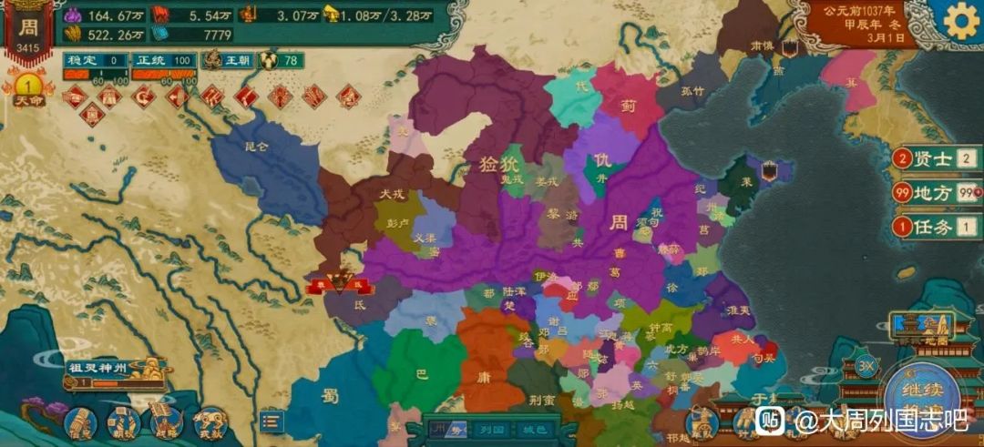 第一年:强征士兵,吞并关中诸多小国,给管,曹,蔡,杞,应,陈,郐发金册消除复国主义,给商,管降爵,在洛邑修建陪都,尽量调停诸侯战争