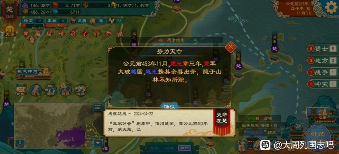 灭吴+区域占领任务,上来先查看先需要占领的区域。主要就是推平吴,外加邗越和北面一些小国。