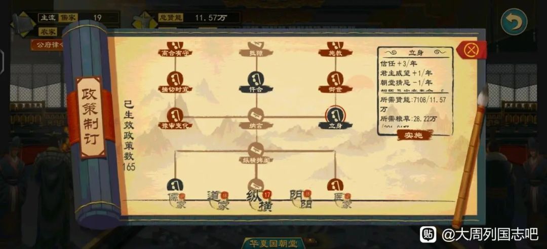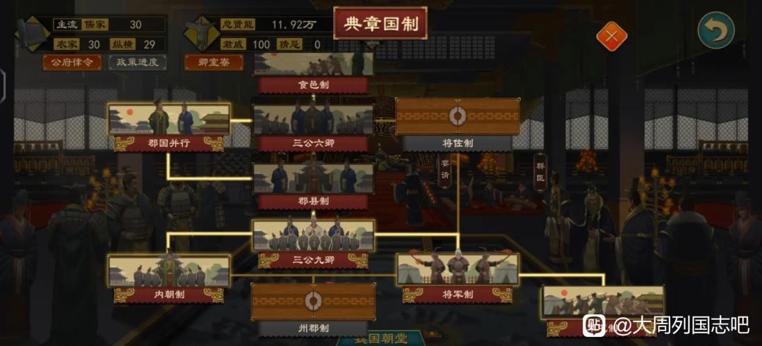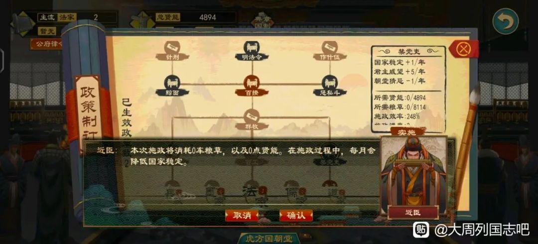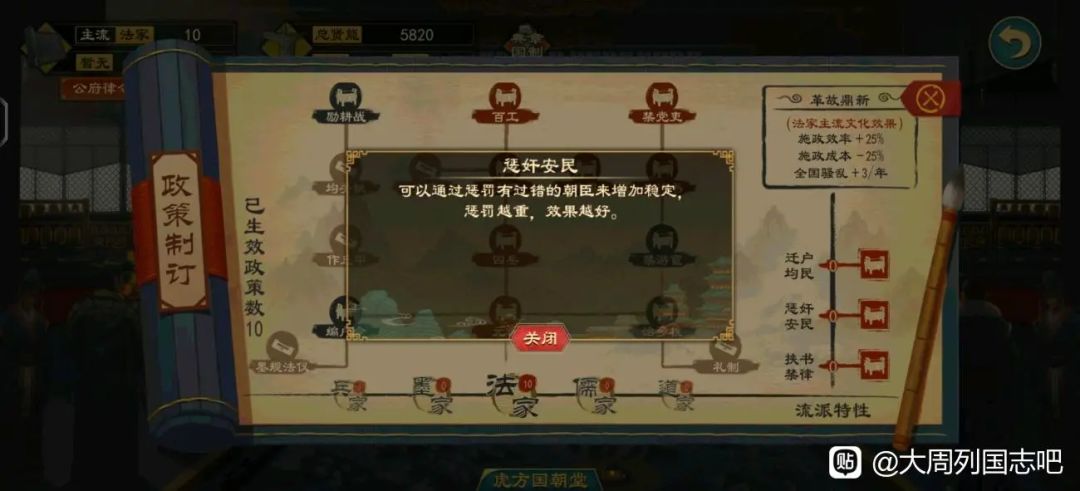 法家玩法:法家优点在于施政快,换人方便,可以帮助政策成型,玩法复杂,但是强度不逊色于儒家