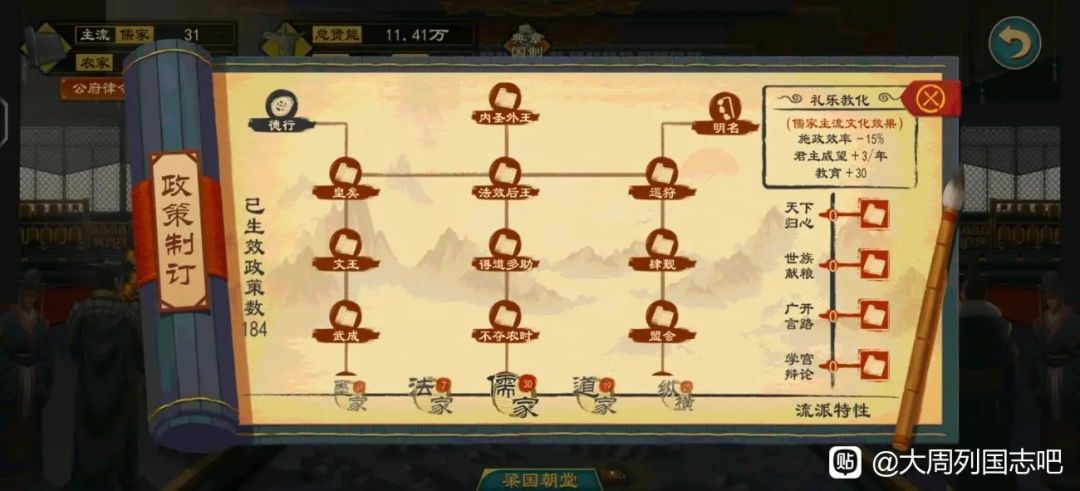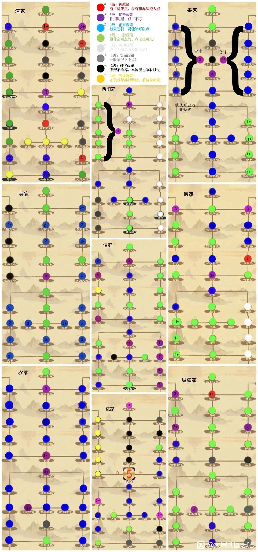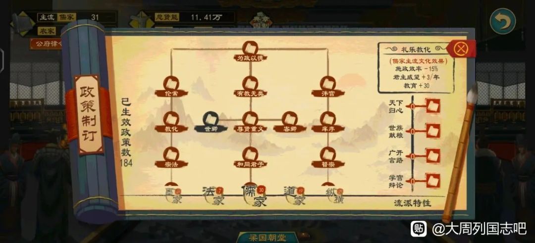 儒家:适合大国,顶尖流派,集中了大部分减骚乱,减判心政策,主流+30教育,堪称人才流水线,政策除世卿之外都可点