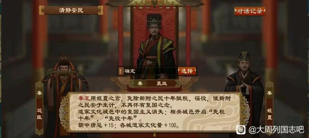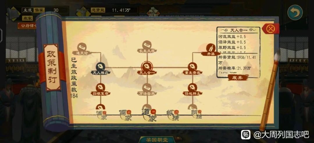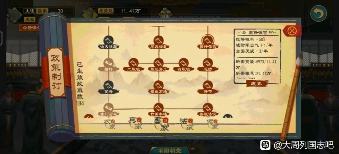 政策选择上,先点满除世卿外所有儒家政策,再点部分减厌战墨家政策,加上几个加粮产的神政策