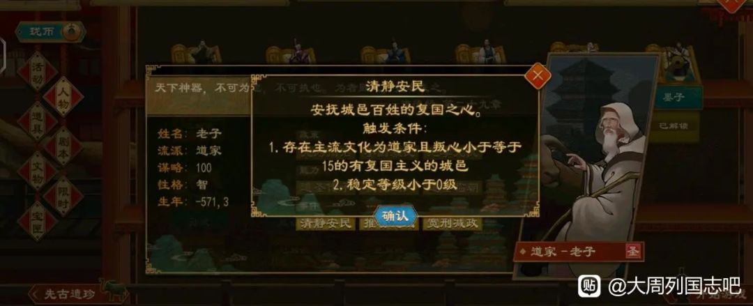 玩法:配合老子,利用无中生有能力,跳过大量负面政策,然后利用老子消除复国的事件,快速消除复国