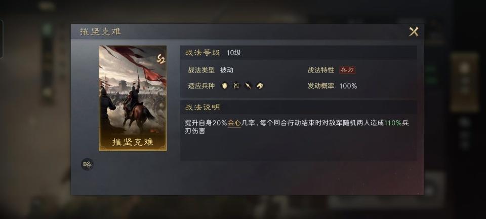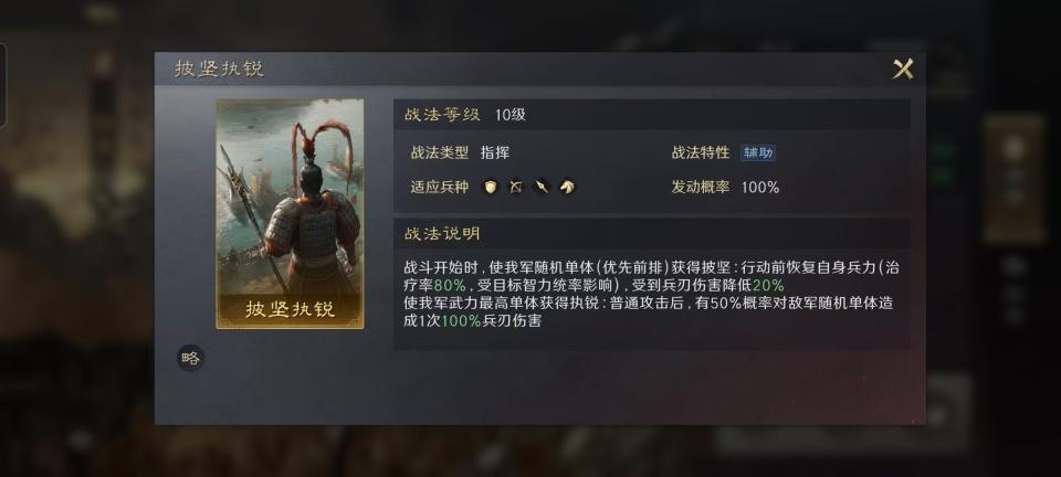 因为程普的关系,久周丨长卿在此战中选择摆出了箕形阵。在兴王定霸的基础上,第二和第三战法分别习得了披坚执锐和铸甲销戈。个人感觉给程普搭配披坚执锐是个相当明智的选择,既照顾到了给程普套壳,更是让本队里武力值最高的马超可以在普通攻击之后给敌人追加更多的兵刃伤害。