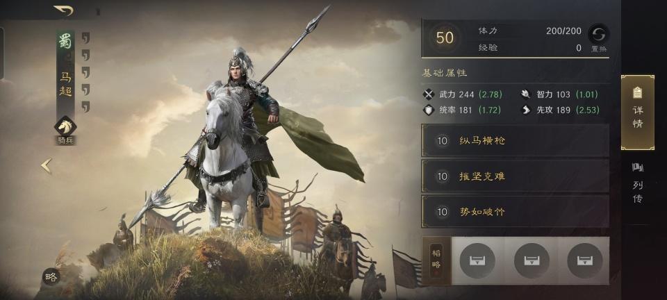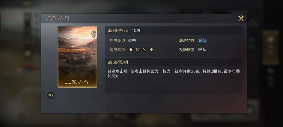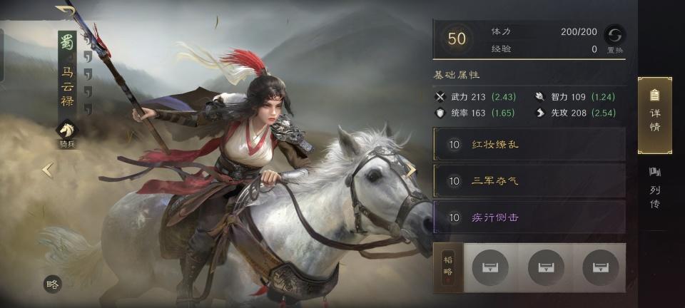 马云騄和哥哥马超都被安排在了箕形阵的后方,吃到12%的伤害提升。在红妆缭乱的基础上,后续习得了三军夺气和疾行侧击。其中有两个战法都是给对手施加畏惧的,显然是要给马超的疯狂输出做足铺垫。令人眼前一亮的是,S2赛季新增的战法三军夺气是通过普攻来全面削弱敌人的武力、智力和统率的。马云騄是交战双方的六个角色里,唯一先攻数值超过了200点的人。换言之,还没等贾诩和徐庶出手,马云騄就已经把他们给削了。