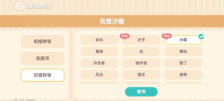 一开始拼称号,总感觉不太合适,怎么拼都拼不符合本人的气质,沙雕爱好领了后,称号总算知道怎么用的,这下肯定可以一鸣惊人!