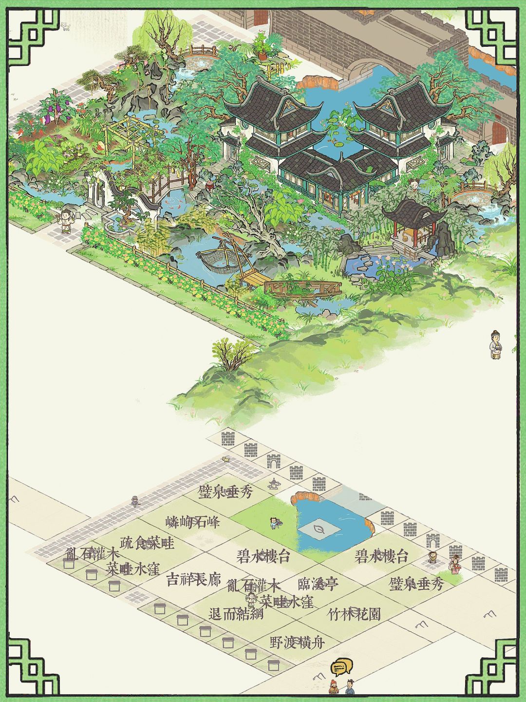 建筑:碧水楼台,临溪亭,吉祥长廊,竹林花园,菜畦水洼,璧泉垂秀,嶙峋石峰,退而结网,野渡横舟,乱石灌木,蔓蔓瓜藤