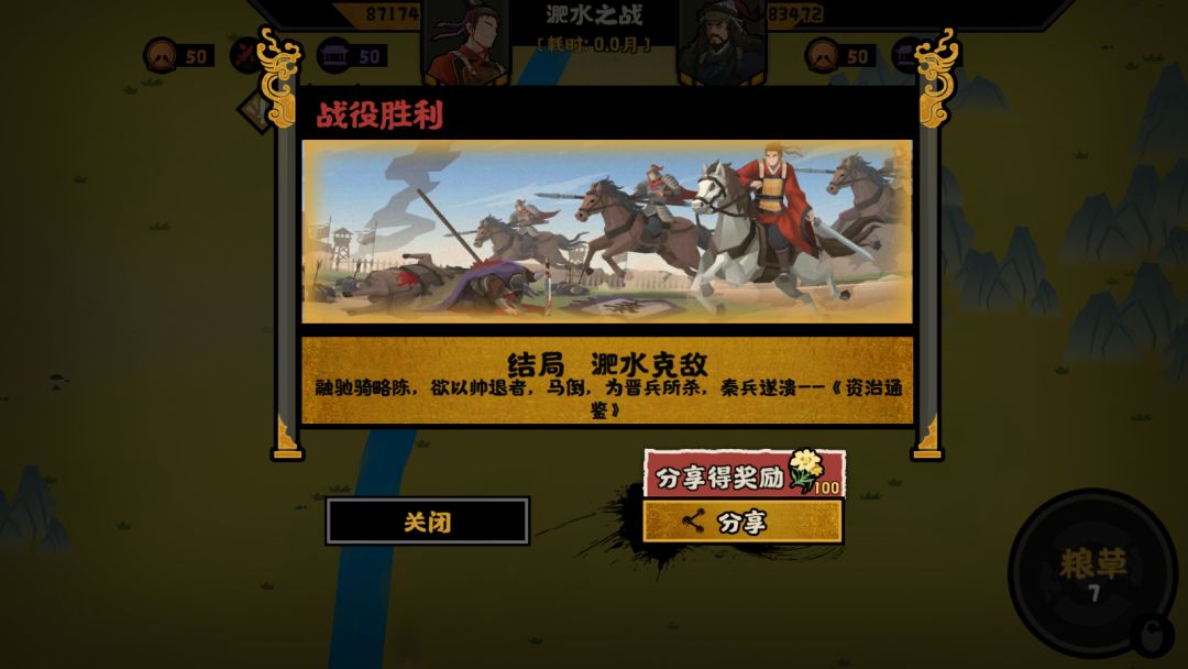 淝水之战战斗胜利后,即可获得【淝水克敌】的结局啦!