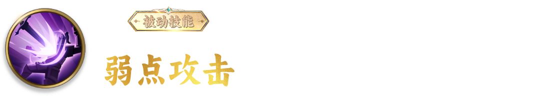 被动技能【弱点攻击】技能效果:普通攻击后有概率对目标造成一次普通攻击伤害(受英雄防御加成),目标身上存在负面状态时,本次伤害提高。该效果短时间内最多触发一次。技能解析:与“暗影束缚”机制相同,基础伤害更高,并能受到负面状态增益,适合与具有添加负面效果的英雄搭配,最大化输出能力。