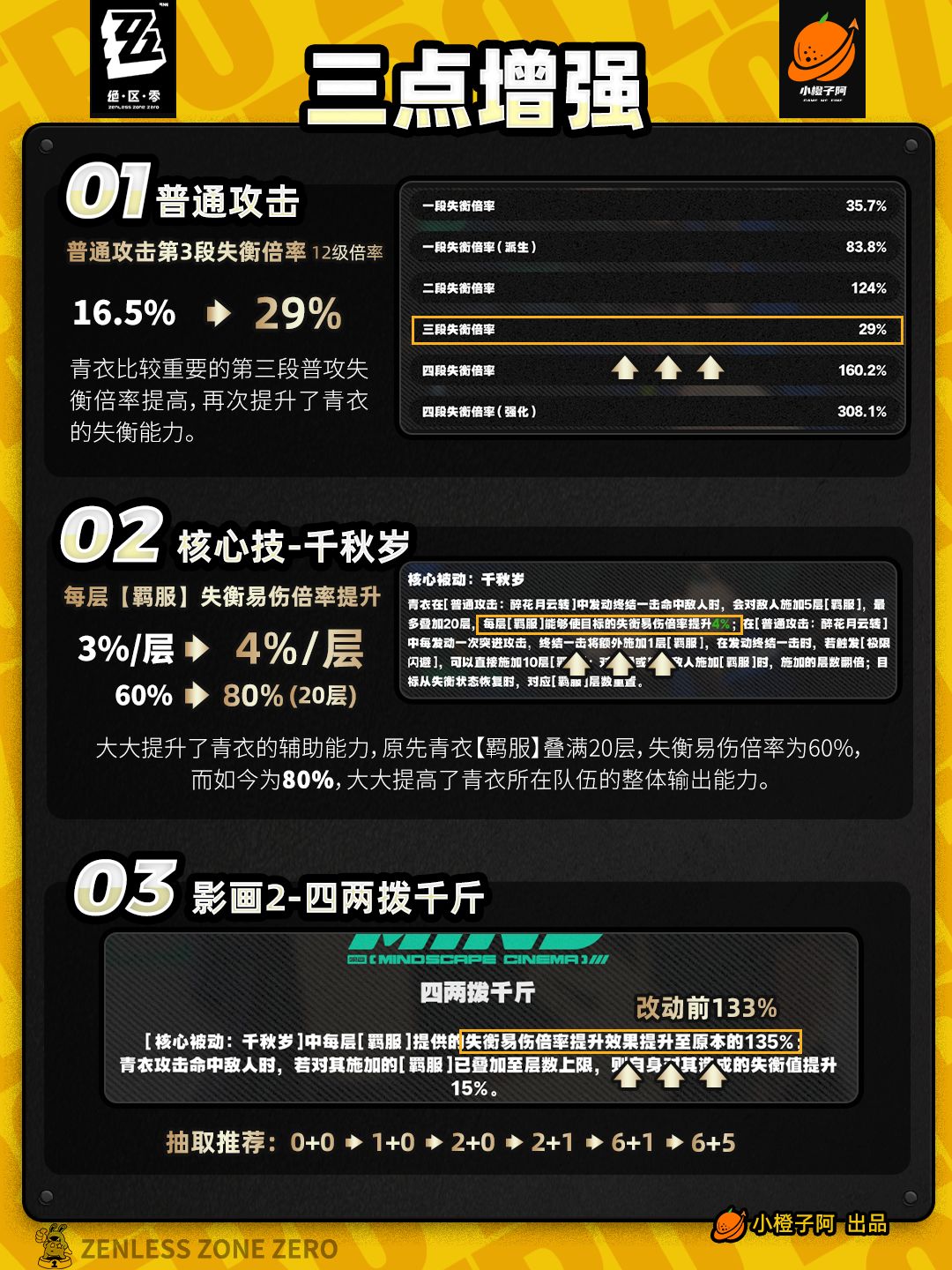 ②核心技【羁服】失衡易伤倍率提升(满层60%→满层80%),大大提高青衣所在队伍的输出能力。