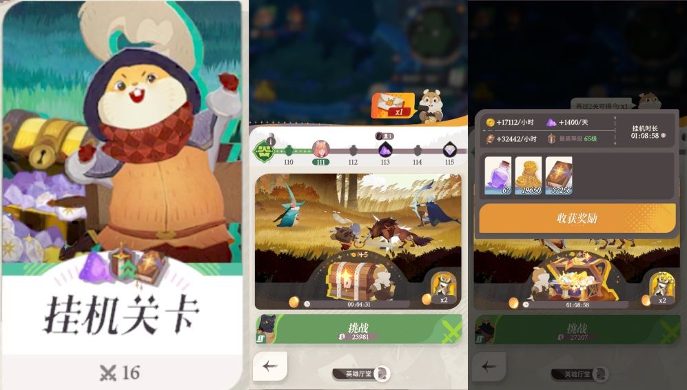 全程开放玩法规则挂机玩法可以持续获取收益,单次挂机时长有限制。推进挂机关卡的层数可以提升挂机奖励及时长,每日可花费50钻石购买快速挂机,直接获得120分钟的挂机收益30关以后可以选择挂机托管至后台进行,继续体验其他玩法~