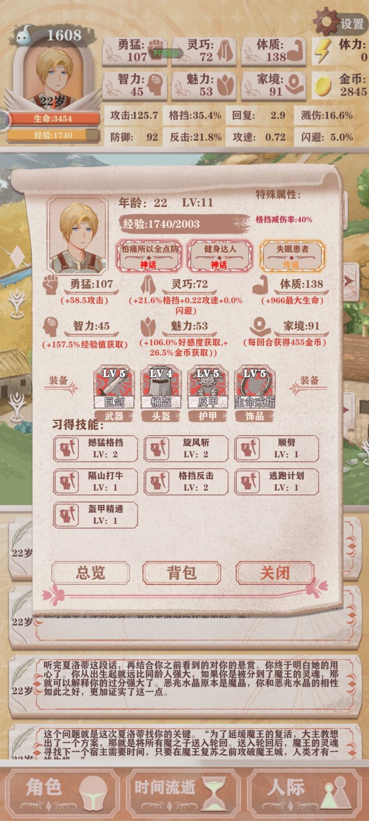 通关用的天赋都是点防御的那个神话天赋,有了后狂加体质,先把血稳住,然后升战力,酒馆基本每次都全点,最多一次存了5000+金币,全部买属性了,800+金币的钻石鱼钩也买了,钓一次有可能加勇猛、灵巧、体质、智力各+1,简直不要太赚,很推荐,魅力高了后一定要去驿站打工,金币多多