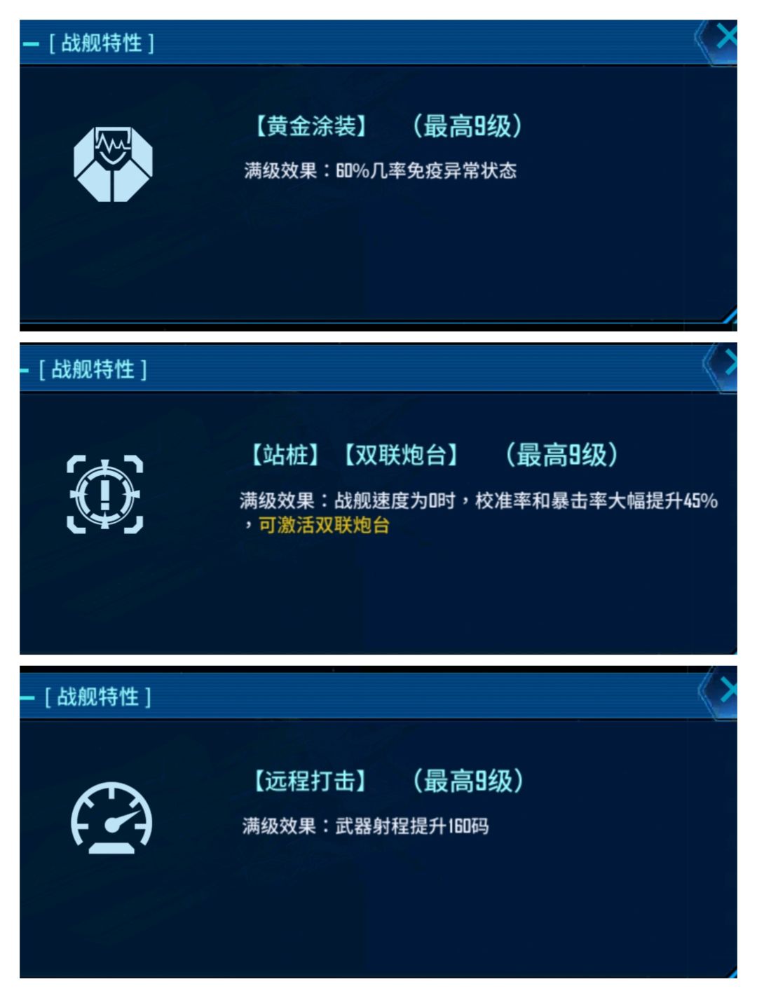 作为帝国招牌战列舰,军团的镜面装甲(大幅降低热能伤害)和耐热护盾给了其比较优秀的防尘埃能力(有点不多),黄金涂装(有60%概率免疫异常状态)则稍微提升了反吸能流的能力,使其尽可能的开出第二炮(其实不报啥希望)同时作为唯一一个可以配装双联反物质主炮的船,在拥有站桩(速度为零时提升45%暴击和校准率)和射程加持(远程打击,战舰武器射程提升160)的加持下,一炮巨兽崩溃,一炮不朽道心破碎,PVP记得带好屏障(笑)