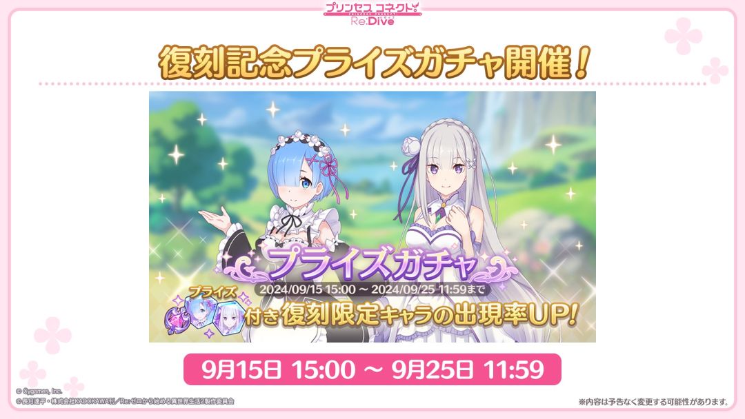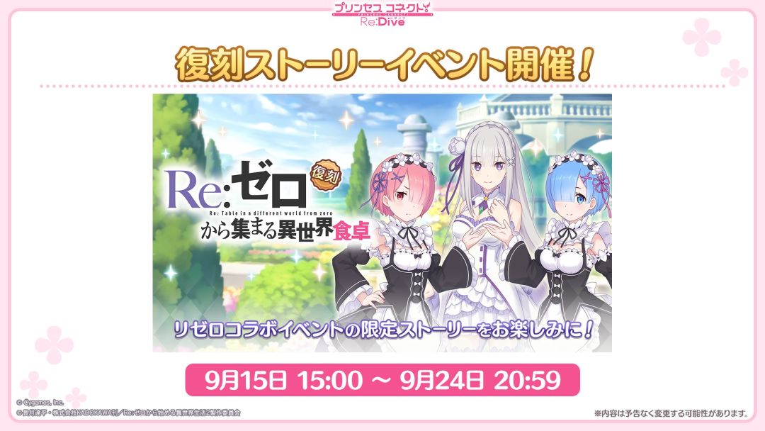 8月31日开始第二次联动活动,9月15日复刻第一次,开启复刻池,原来的艾米莉亚、蕾姆和拉姆六星开放。