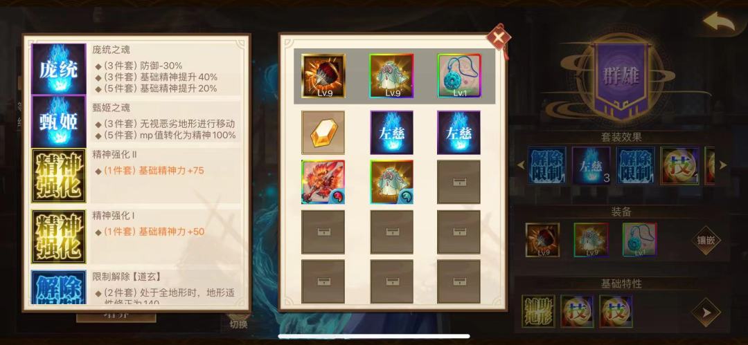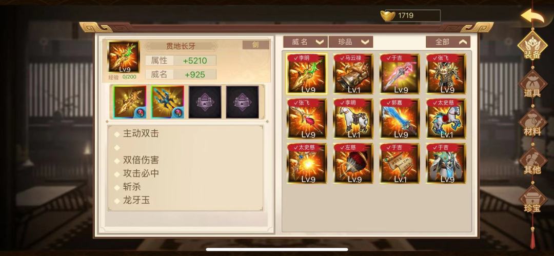 不要被这么多金装吓到,实际用不了这么多,比如张飞和郭嘉凶兽套就行,个人认为应龙武器是必须,李明无治疗反转的话,需要应龙5魂效果处决曹仁,所有16人都要考虑恶路和速度。
