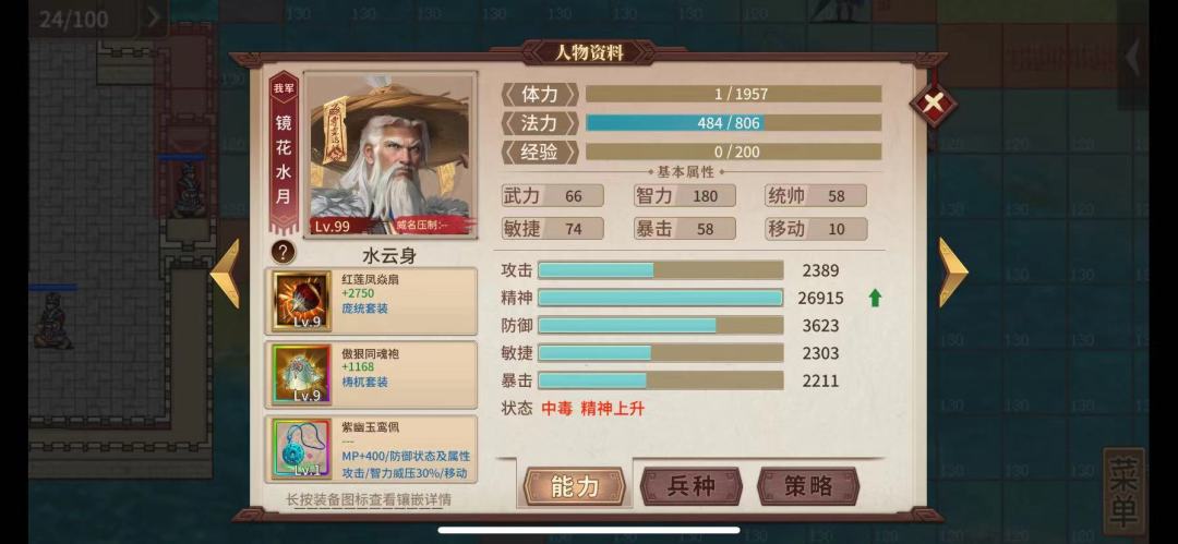 流程:开局全部往右边城跑,太史清被一图打残的神剑无难度,把统帅依次困城里,太史顺便被禁言,然后冲锋大象穿刺庞统(金弓冲锋达到了13%,加距离增伤,尽量打出降防