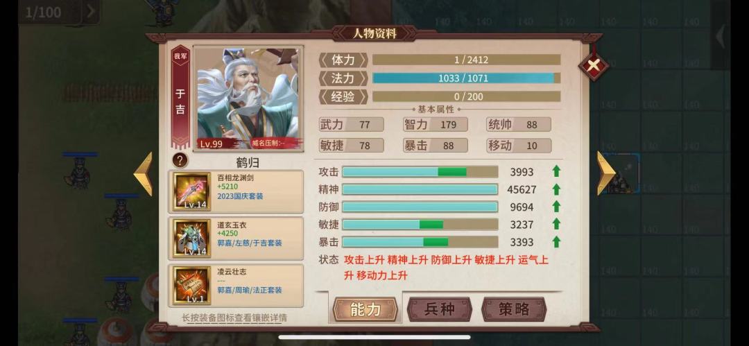 于吉:杀人损血后,精神达到45000,无原力的单击就够了。配高了,孙权撤之前放拜将加二动,诸葛果加速。