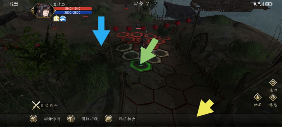 本图绿色箭头为10回合到达位置,蓝色为11回合到达位置,红色为12回合到达位置(目的地)