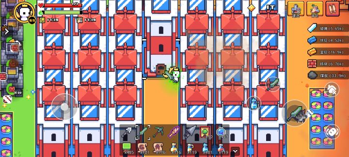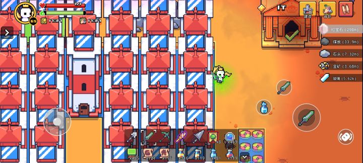 如图这样竖着7列,横着5行,中间掏空,喝贪婪和幸运药水,刷祭坛的双倍物资掉落(图三),在中间刷史莱姆王,我刷了13个,掉的金币就够了,不够的把宝石卖卖就够了,灯塔教无敌