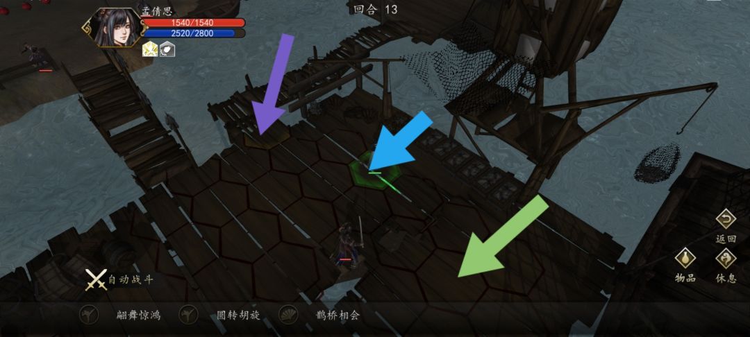 紫色箭头为本回合触发凌波微步要到达的位置