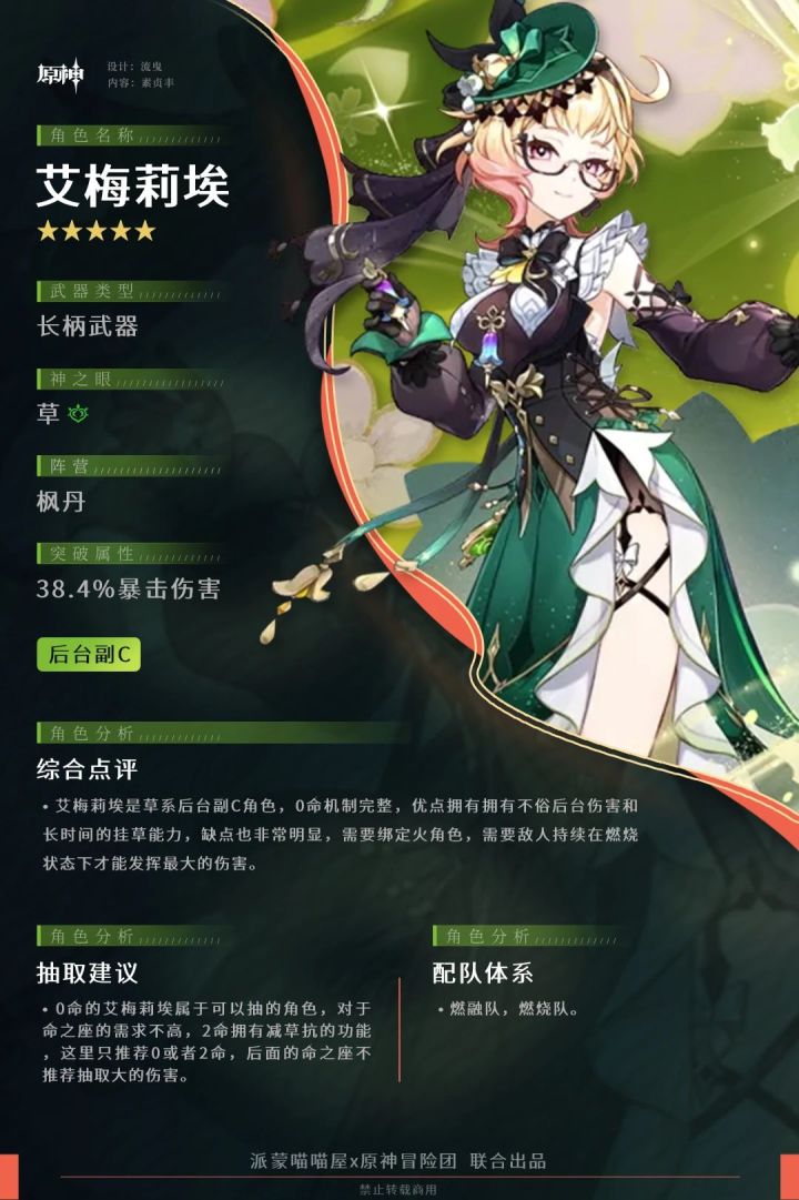 作为第一位和燃烧相关的角色,艾梅莉埃依托燃烧反应打出高额的后台伤害,但很可惜并没有特化燃烧反应,不过强度还是非常在线的,喜欢可冲!