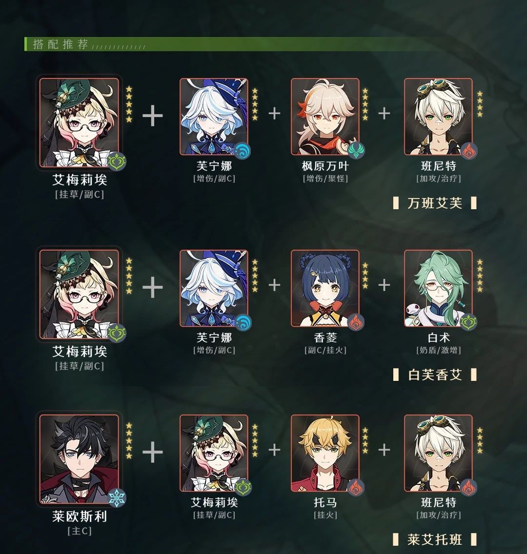 艾梅莉埃的配队主要是通过燃烧可以提高艾梅莉埃的直伤,配合特定的角色可以增加整队的伤害,只要燃烧强火的特性,用冰水雷都能打出不错的反应伤害