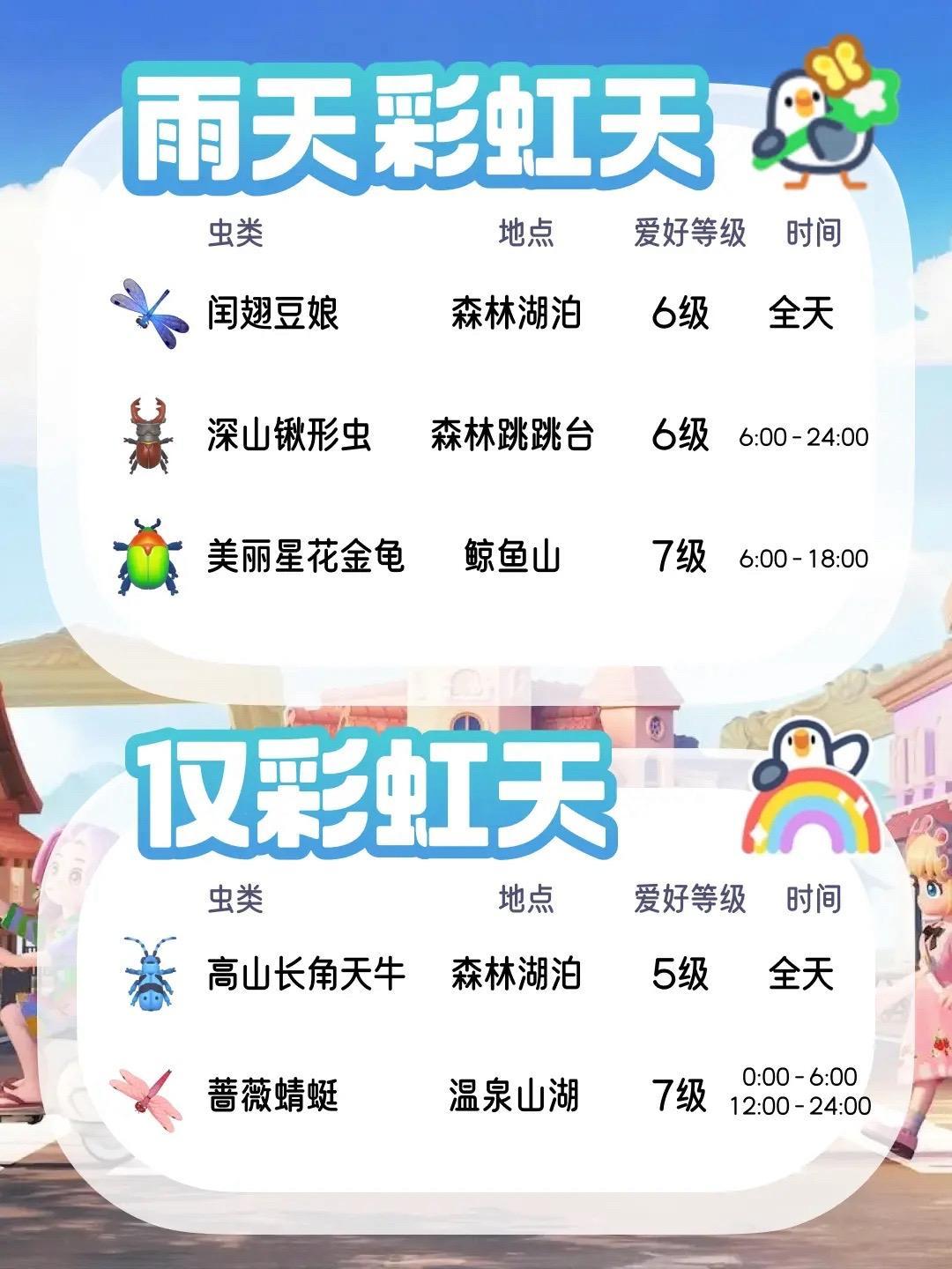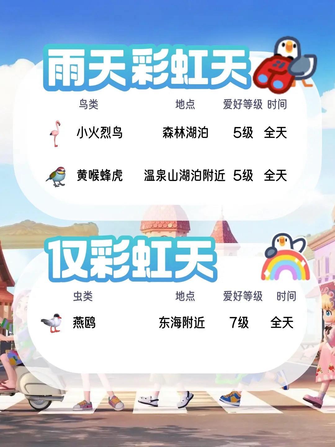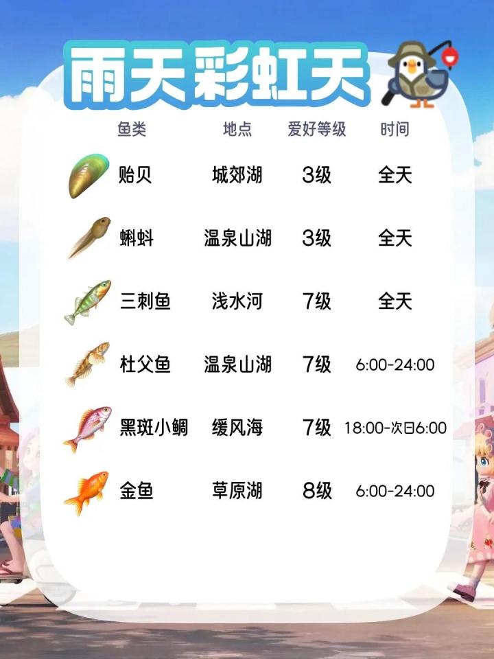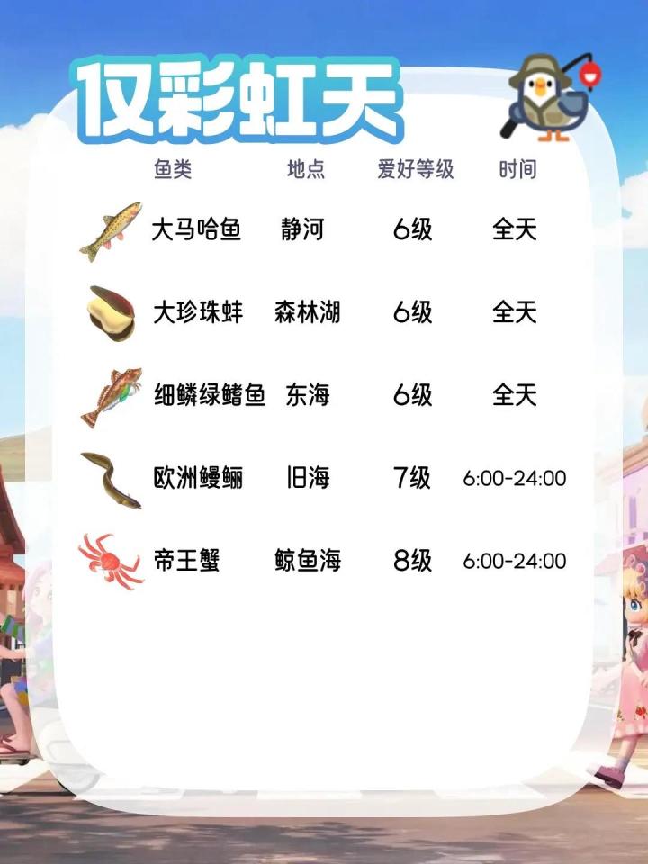 彩虹天会出现一些稀有鱼类,以下是部分可钓到的鱼种及地点(未写明时间的表示全天可钓):
