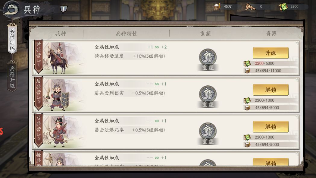 兵种训练共有5个兵种类型,分别为骑兵营、盾兵营、弓兵营、枪兵营、器械营。道友可以使用训练点,消耗资源对兵种进行升级训练,强化部队属性。兵种训练升级达到特定等级,还能解锁兵种特殊能力。
