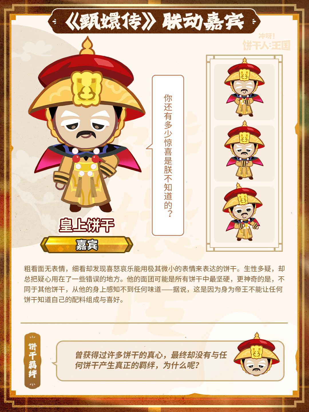 稀有度:嘉宾(特别提示:本次登场的饼干为「嘉宾」品级,饼干朋友们可以在王国中与他们互动,但「嘉宾」饼干不可参与战斗。)
