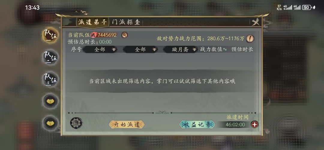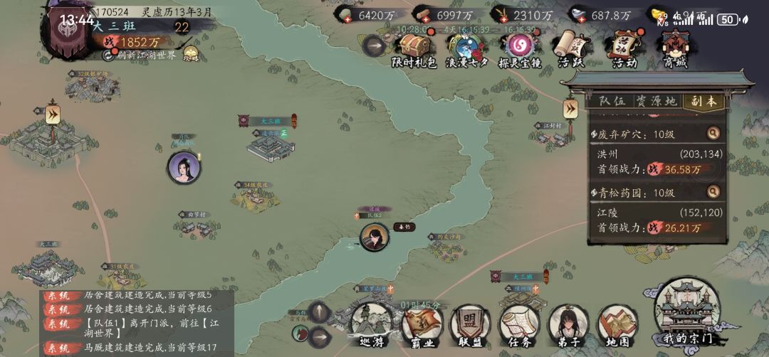 巡游功能有些类似于其他游戏的搜索,主要是方便寻找世界地图上的势力及野怪。巡游分成两种,派遣弟子及门派探查。派遣弟子设定后可以实现一键清理野怪,采集,开宝箱,有两片资源地图的时候,通常可设定主队打怪开宝箱,其他队伍采集,省去找怪找资源地的时间。巡游的时候要保持在游戏界面,不能退出。门派探查类似于搜索,会选定区域,方便查找世界地图上占领资源,势力,随机事件的位置。