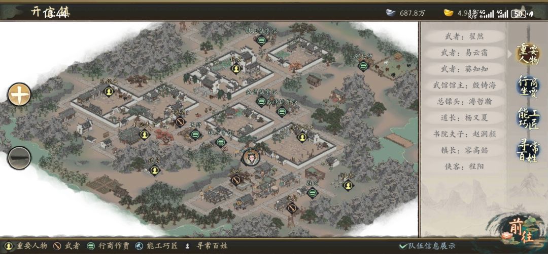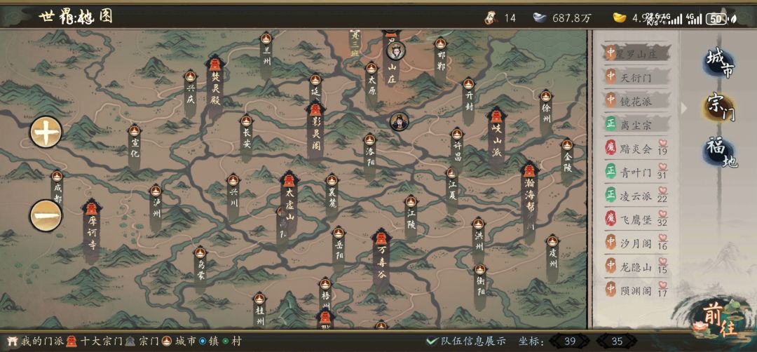 地图分为两部分。世界地图界面时,点开地图,会显示城镇、宗门位置,以及宗门友好度,地图划分不同的区域,方便查找。城镇界面时,点开地图,会显示所有npc位置,并做了区分。任务期间首领在地图上会显示为骷髅头。
