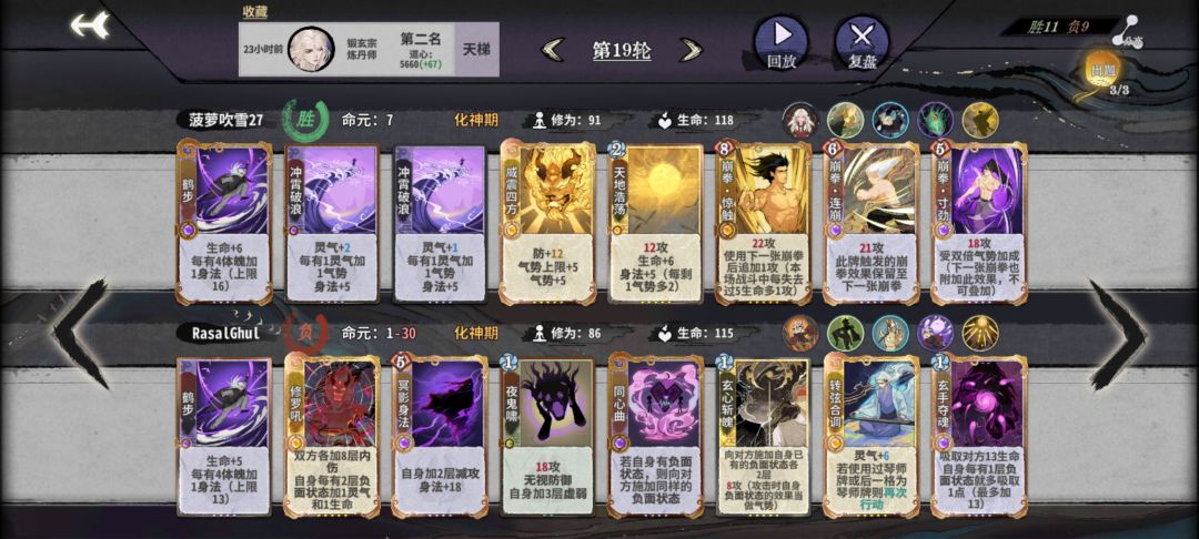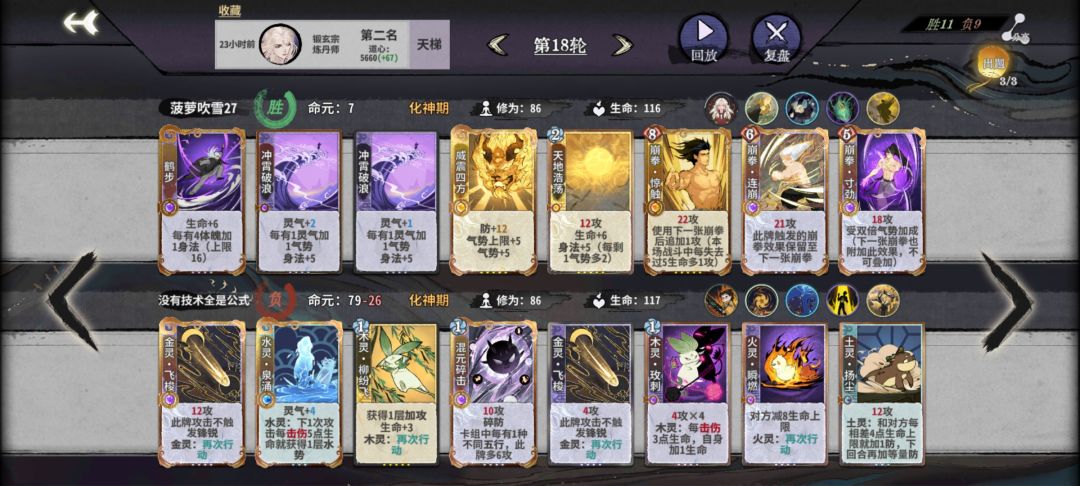 比如遇到命狂挂外伤,双斩很厉害,这样能挂4层减攻4层外伤,再配合万玄清掉外伤,对面没伤害,自己伤害还高(图四(打到百杀就赢了,玄手是没其他牌了放上去补伤害,这说明迎风掌不要随便丢