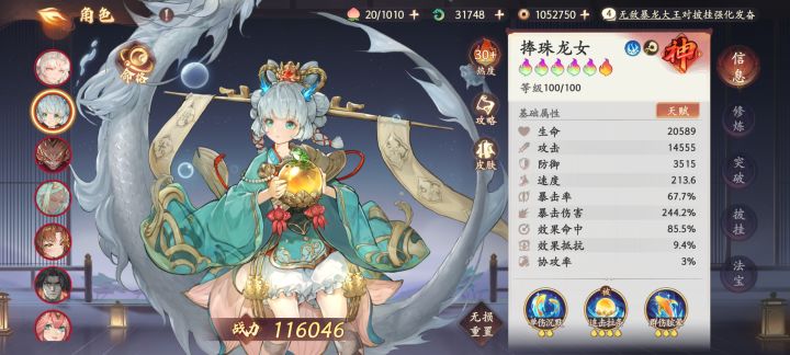 首先说一下龙女的定位,对我来说打了快三个月的披挂没有一个5速,龙女算是救场的,蜘蛛沉默龙女概率不大,沉默龙女狐狸就放出来了,对面地藏大完龙女就出手了,龙女出手结束阎王也出手了,优先级是这样的,所以不存在秒了燃心复活起来大的情况。打肉的时候一般地藏的减防就被插队国王清了,龙王大完清buff降命中还破防。当然不要扯什么抵抗这了哪了的,我这命中两件没穿,也没加命中,命中85上限,我这披挂还是随便穿穿,说一千道一万,90%的控制真的不香吗?这游戏有多少控制技能?我没有忽悠你们抽,我只是说说自己的用得感受。