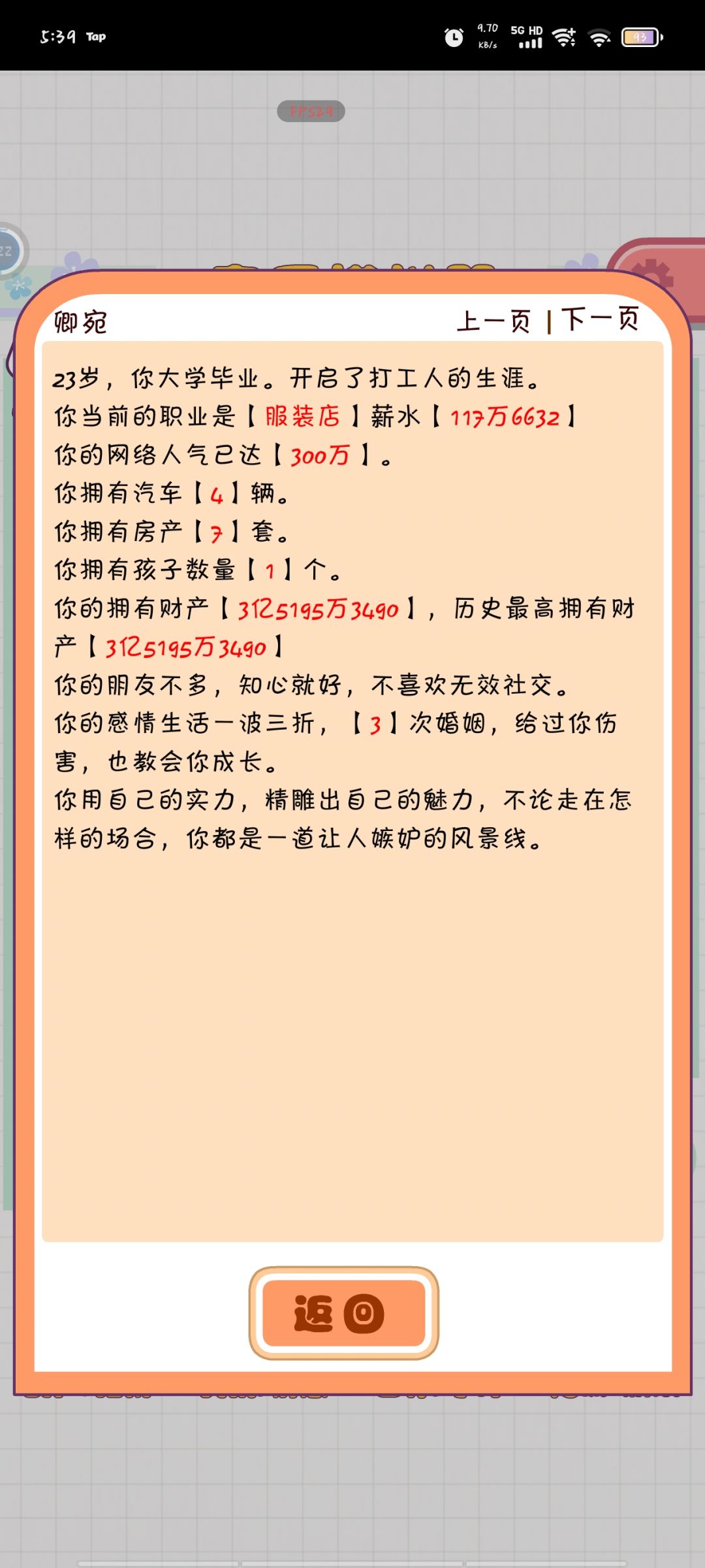 想开第六家服装店,不知道为啥开不了(难道是我的情商太低了吗)。刚开始都拒绝认识异性,现在后悔了,因为要赞礼物义卖😭名姝派对加声望太费钱了。不过后面的结果是好的,钱对后面的我来说只是一串数字👏。我赚钱不靠投资,因为我偷投一次,赔一次,不管成功率多少,就是赔,投了超多次,只赚了一次