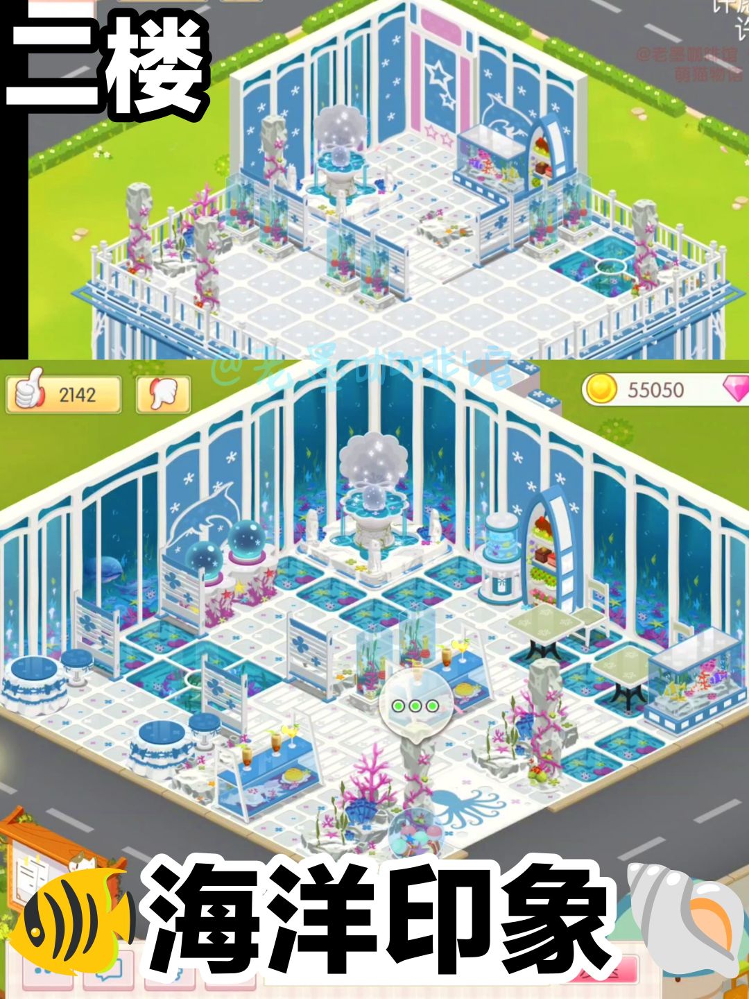 每种主题的家具都有特别标注,玩家也可以拆分自由搭配。而且老墨最喜欢的一点就是店面不是那种无限扩张的类型,后期升级小二层,但总体面积就图上(参考海洋印象这张图)那么点