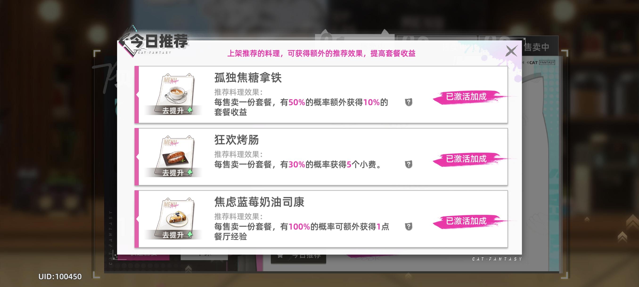 7.皮肤加成,突破至ur可以获得炫彩皮肤,皮肤升级给的属性特别多,算是第三好获取战力的点,升级皮肤的花可以在小费商店获得,想要快速刷小费需要消耗猫眼石买大量售卖券,刷取小费的时候记得注意食材评级和店员猫娘的特效(如图三,四所示)
