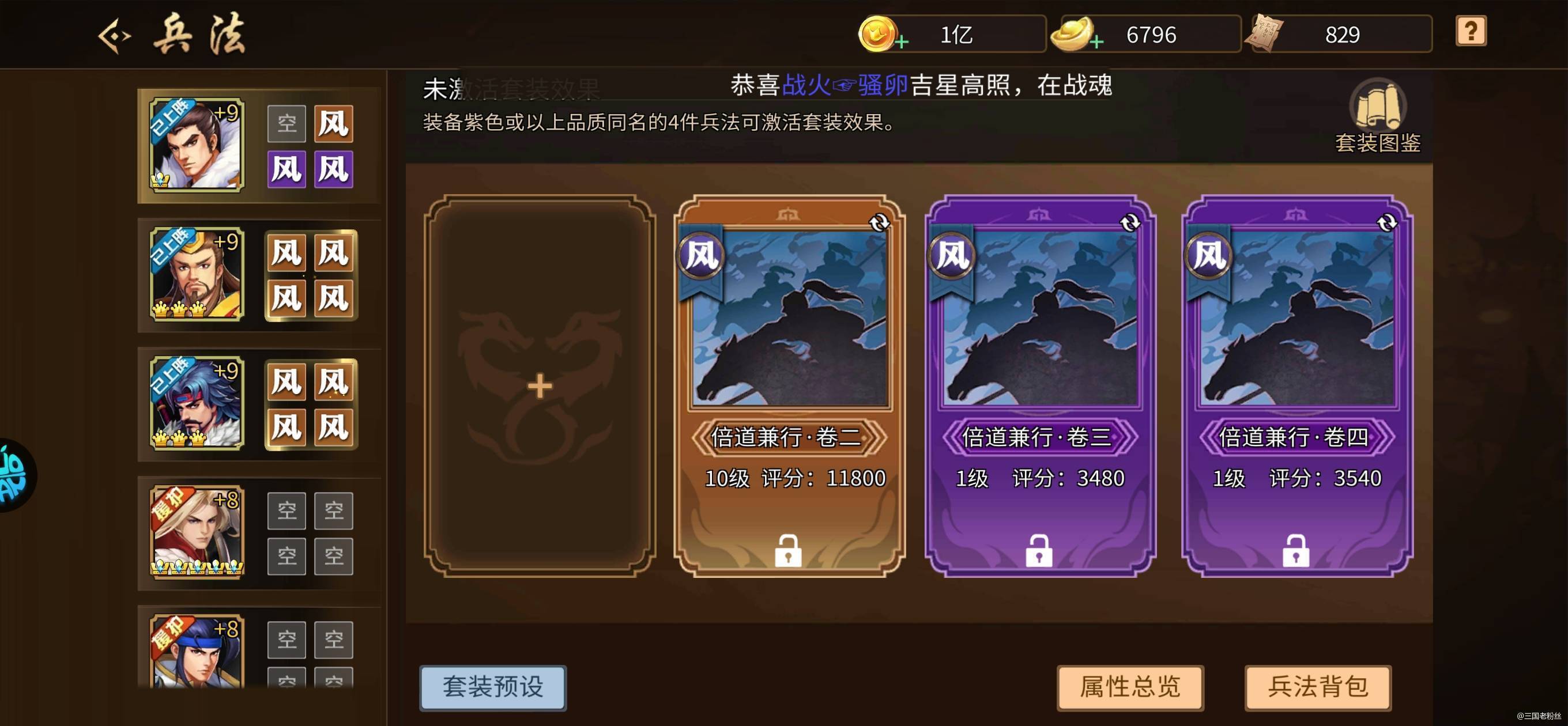 最近混迹于各大群,看到很多不懂的玩家说要培养一堆兵法,其实不是这样的,兵法这个东西,大多数号,有3套不同的主力即可,然后5套紫色多星给援护,或者4套橙色主力,4套紫色援护。