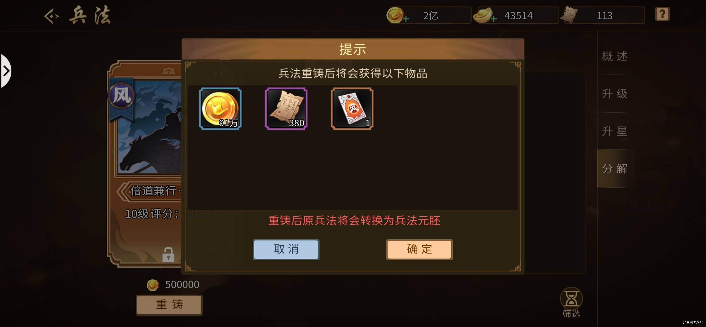 而10级橙色兵法重铸,也只给你380残片,还有一个用于升星的兵法元培。