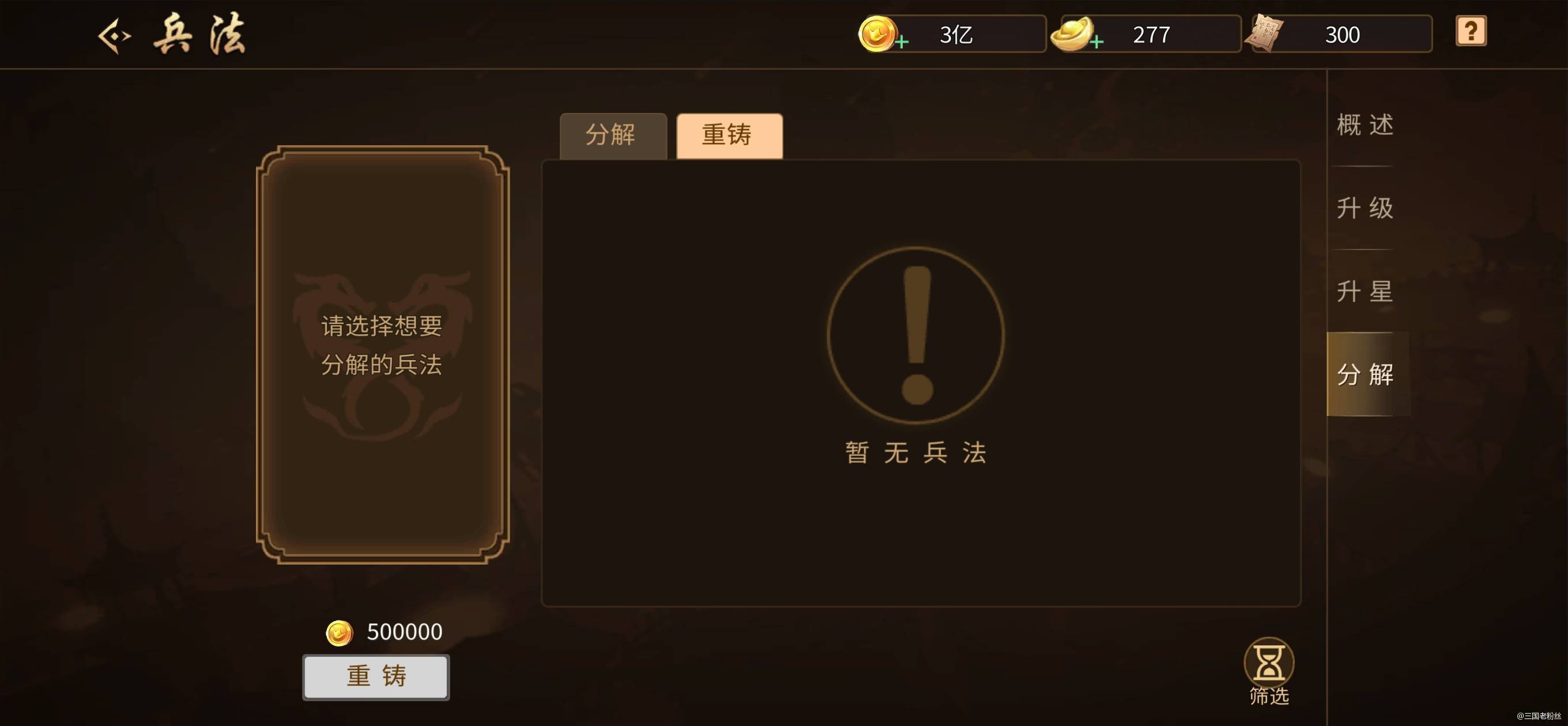 我自己有个试运气的方法,就是橙色兵法选择一些自己合适的,升级到10级,试运气看升出来什么副属性,运气好开出来统帅值或者攻击,还是对自己有用的属性攻,就不错,运气差的,升出来各种防御的,那以后就是重铸货,留着给极品兵法升星用。