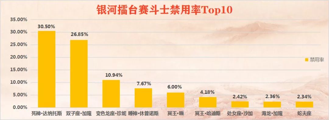 本期榜单中禁用率前三的斗士分别是死神、双子加隆和珍妮,另外蛇夫座·奥德修斯和海龙加隆的禁用有所提升挤进前10位,而处于第11和第12位的则是米诺斯和蝴蝶。