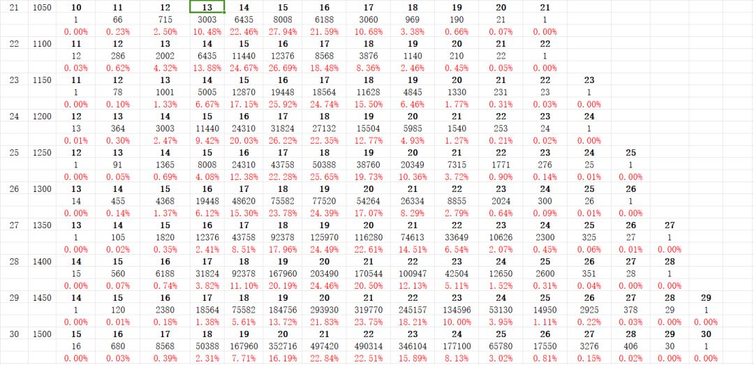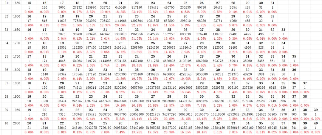 然后我继续思考为什么是斐波那契数列,然后,让我找到了规律:因为每一档抽到n个心愿的次数等于前两档抽到(n-1)个心愿的次数