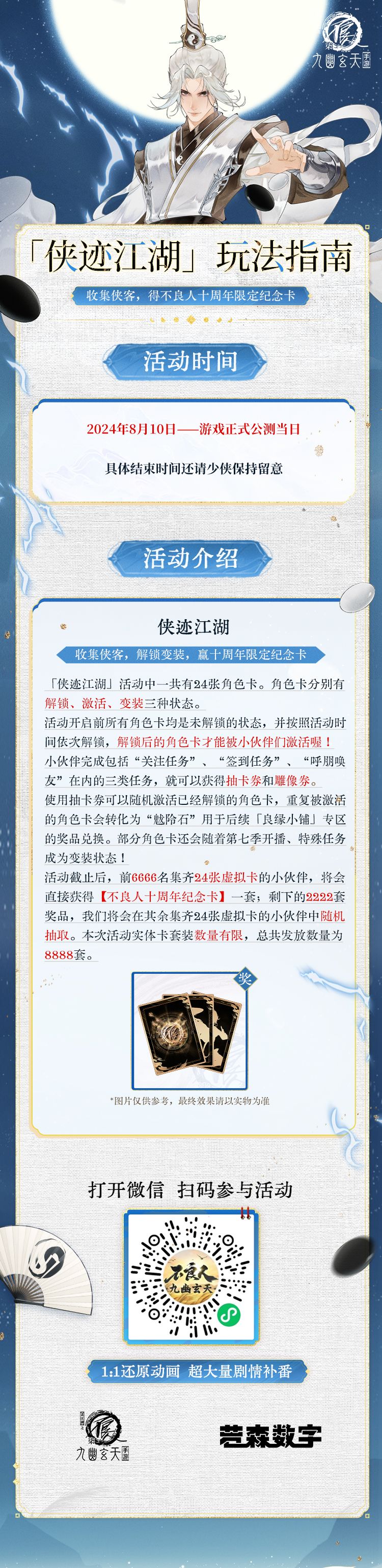 为了让大家参与的动力更强,幽妹总计准备了8888套【不良人十周年纪念卡】送给大家!库存满满~前6666名集齐24张虚拟卡的小伙伴,将会直接获得【不良人十周年纪念卡】一套,剩下2222套奖品,我们将会在其余集齐虚拟卡的小伙伴中随机抽取!少侠们快冲!先到先得啦↓↓↓