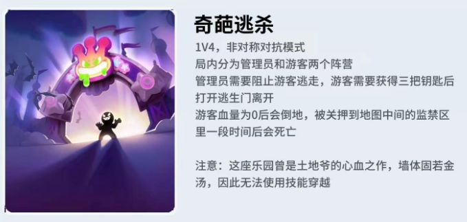 由此可见,管理员视野偏小,仅有眼前小块扇形区域。管理员的防御力大大提升,游客需要更多力量才能反击。管理员将游客击倒后,游客不会立即死亡,而是进入倒地状态。倒地时可以被管理员抱起丢入地图中间的监狱,其他游客将更难营救。游客倒地一段时间后将被淘汰。管理员淘汰一半以上游客,管理员胜利。