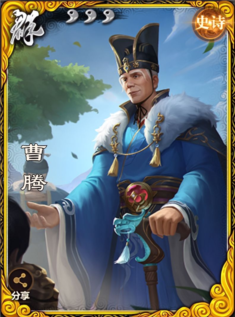 曹腾的收益非常稳定,一轮4收益稳稳的幸福,说是小腾子完全没毛病。在现在强将层出不穷的环境下也稍微能看,是一个比较全能好用的辅助。选势力的机制在OL算是首次安排给神武将以外的武将,曹腾可以说是OL第一个上线的“双势力”武将,曹腾开了个头,也期待一手新的双势力武将。