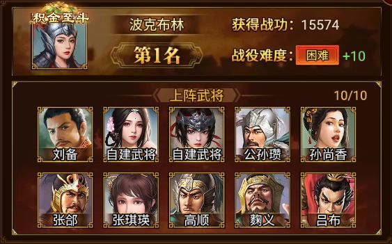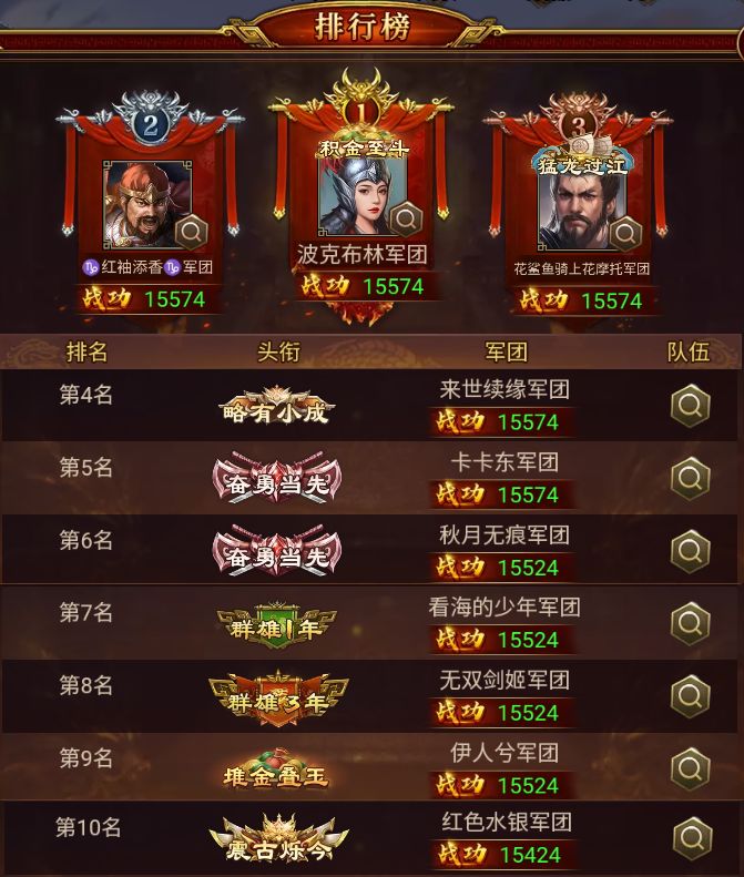 其中,波克布林、红袖添香、花鲨鱼骑上花摩托、来世续缘、卡卡东 军团以 15574 的战功,成功达成益州之战最高战功,拿下TOP5的殊荣,恭喜!