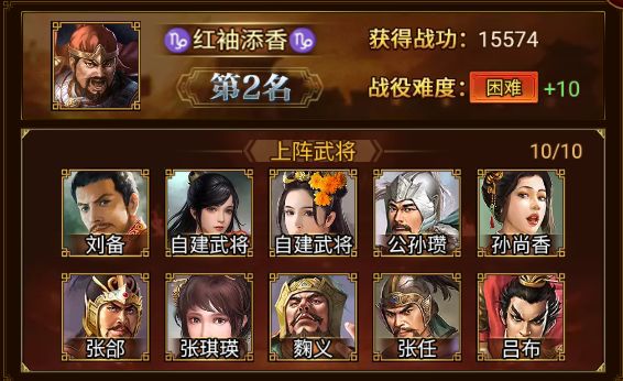 刘备、公孙瓒、孙尚香、张郃、张琪瑛、麴义、张任、吕布、自建武将*2