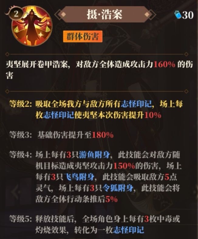 摄·浩岸:吸收印记,加强自身群攻输出,多层印记有额外效果。(满级之后能够额外吸收火/毒转化印记)。