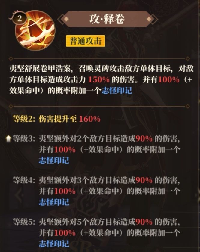 攻·释卷:攻击单体叠加一层印记,升级提升攻击数量(单个目标可叠加)。